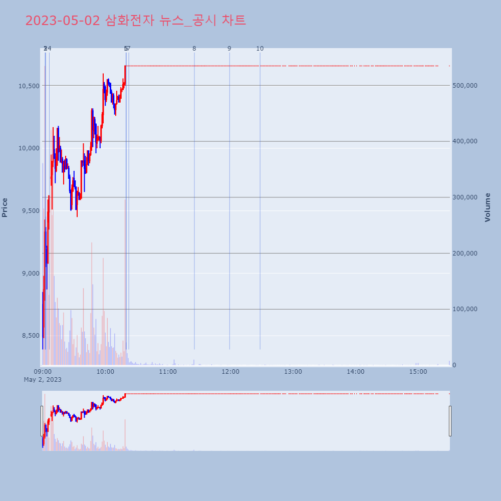 | 10 | [강세 토픽] 무선충전 테마, 삼화전자 +30.00%, 포스코DX +6.19%[무선충전] 테마가 강세다. 전일 대비 3.76% 상승 | 조선경제 | 삼화전자 | 2023-05-02 12:28:28 |