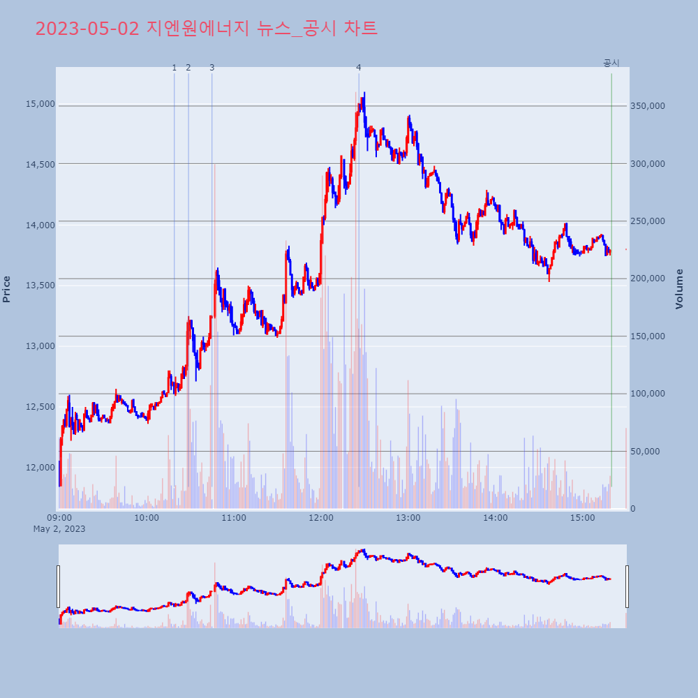 | 3 | 지엔원에너지, +8.70% VI 발동지엔원에너지가 VI가 발동했다. 전일 대비 8.70% | 조선경제 | 지엔원에너지 | 2023-05-02 10:45:04 |