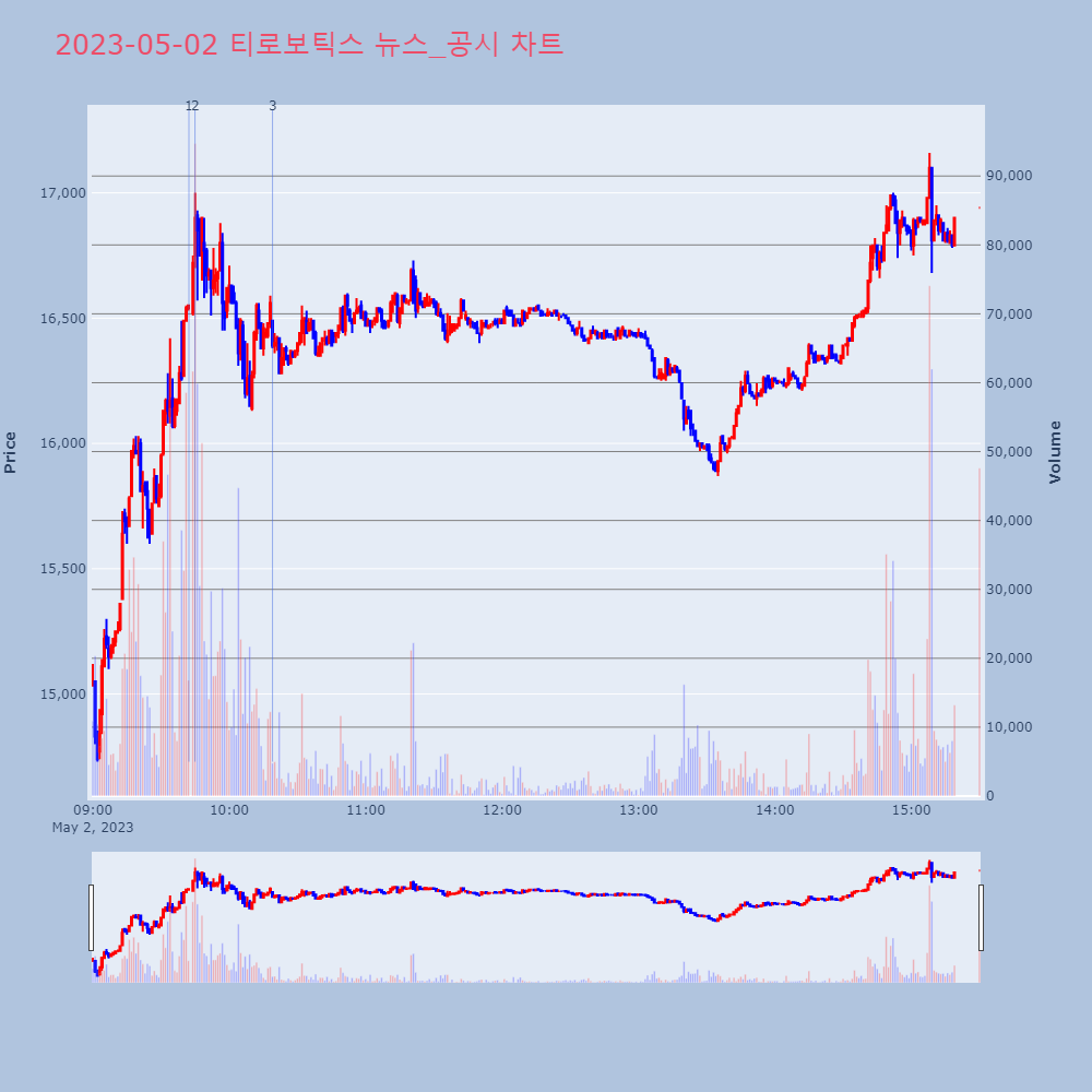 | 1 | 티로보틱스, +10.33% VI 발동티로보틱스가 VI가 발동했다. 전일 대비 10.33% | 조선경제 | 티로보틱스 | 2023-05-02 09:42:15 |