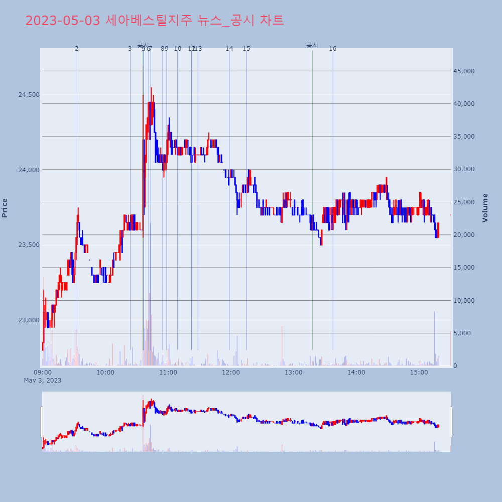 | 14 | [강세 토픽] 스페이스X 테마, 세아베스틸지주 +5.27%, 솔루엠 +4.30%[스페이스X] 테마가 강세다. 전일 대비 2.1% 상승 | 조선경제 | 세아베스틸지주 | 2023-05-03 11:58:33 |