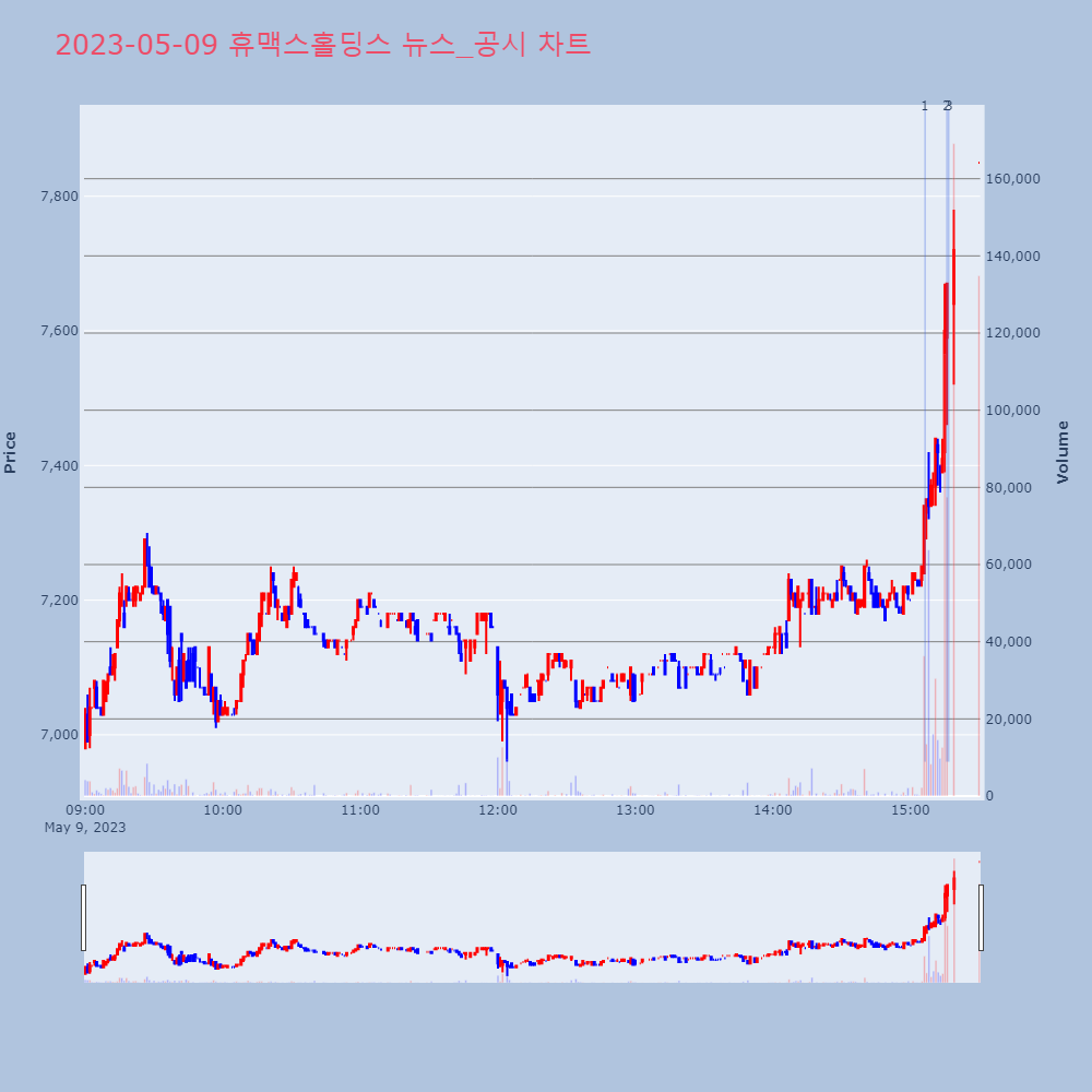 | 3 | 휴맥스홀딩스, +8.37% VI 발동휴맥스홀딩스가 VI가 발동했다. 전일 대비 8.37% | 조선경제 | 휴맥스홀딩스 | 2023-05-09 15:16:47 |