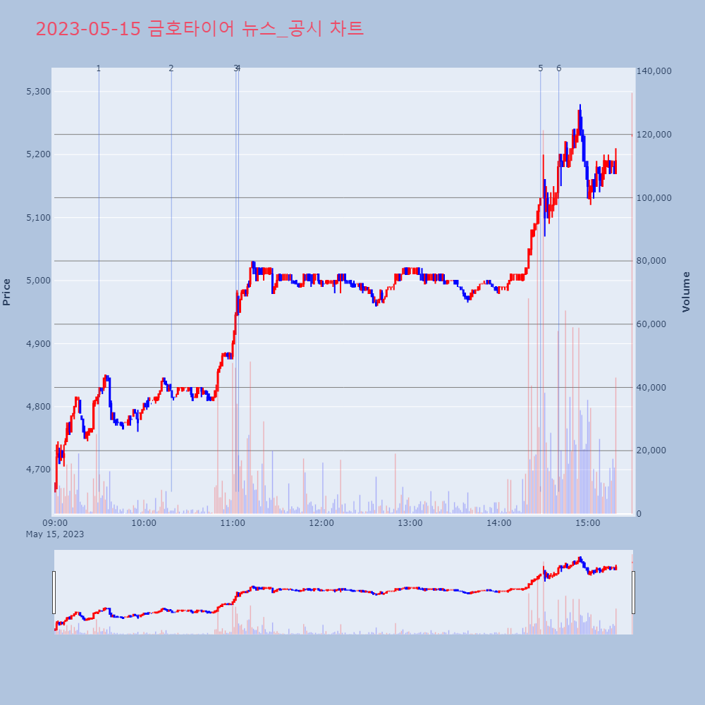 | 5 | 금호타이어, +9.87% VI 발동금호타이어가 VI가 발동했다. 전일 대비 9.87% 상 | 조선경제 | 금호타이어 | 2023-05-15 14:28:09 |