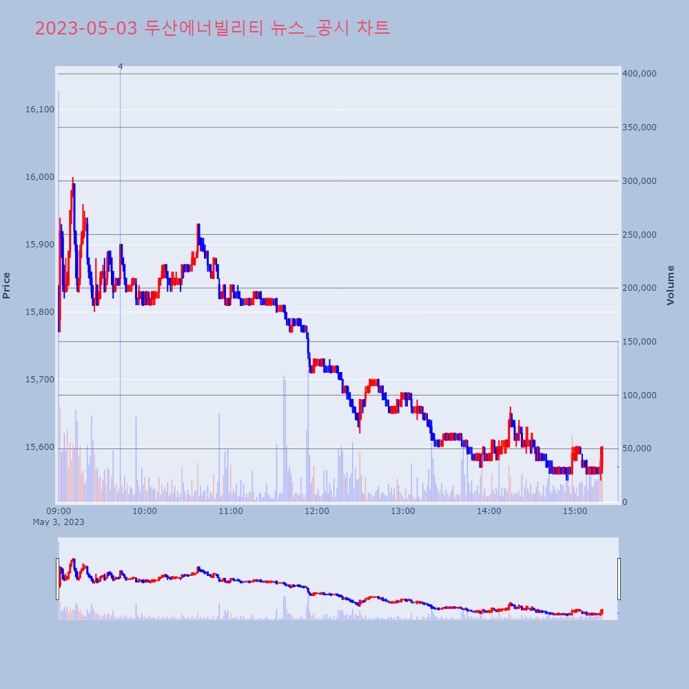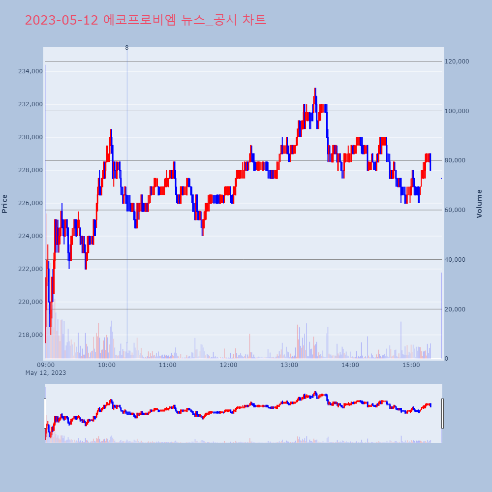 | 4 | 이브이첨단소재, +16.86% VI 발동이브이첨단소재가 VI가 발동했다. 전일 대비 16.86 | 조선경제 | 이브이첨단소재 | 2023-05-12 09:15:58 |