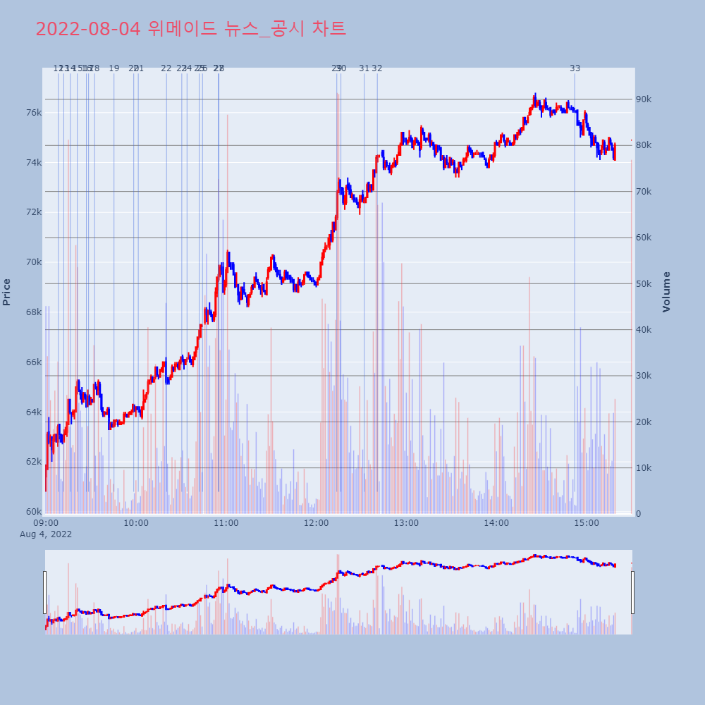 | 12 | [한경라씨로] 장현국 대표 간담회 이후 위메이드, 위메이드맥스 주가 강세한경라씨로는 인공지능(AI) 알고리즘을 기반으로 상장 | 한경/증권 | 위메이드 | 2022-08-04 16:44:00 |