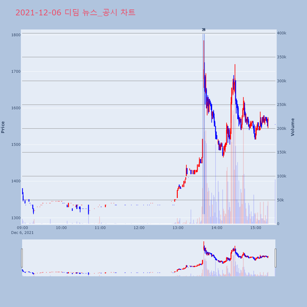 | 1 | 디딤, +10.18% VI 발동디딤(217620)이 VI가 발동했다. 전일 대비 10 | 조선경제 | 디딤 | 2021-12-06 13:38:27 |