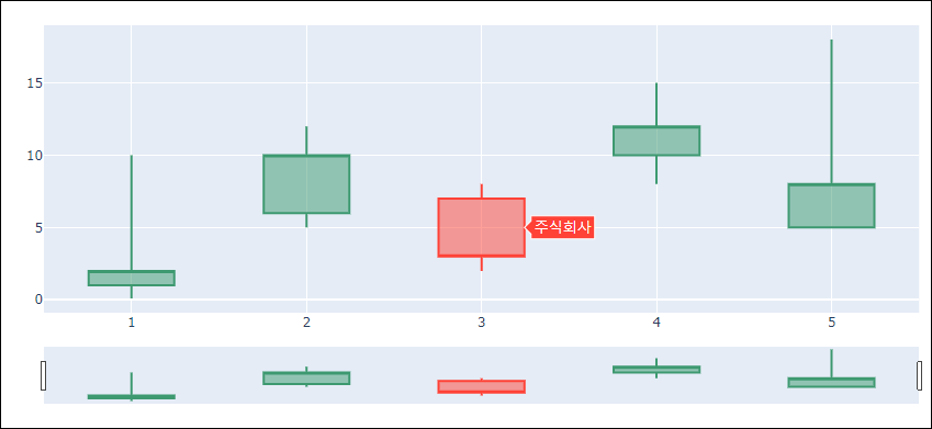 # 리스트에 각각의 값을 넣어주면 캔들마다 표시가 됩니다. 다시 말해 위와 같이 text='캔들차트' 하나만 넣게 되면 모든 캔들에 '캔들차트'라고 뜨지만 아래와 같이 리스트로 정해주면 정해준 숫자만큼 앞에서 부터 지정이 됩니다.