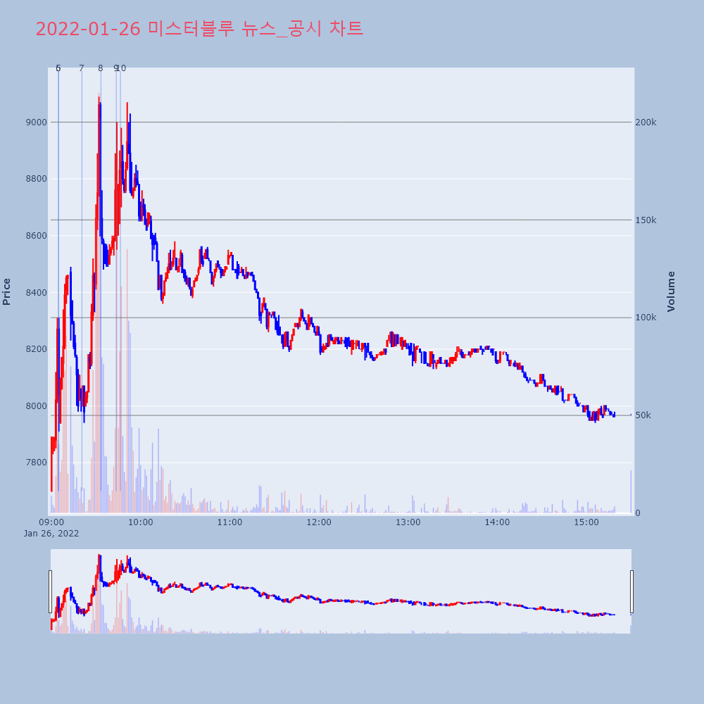 | 8 | [특징주]미스터블루, 자회사와 위메이드 MOU에 강세▶ 하이스탁론, 선취수수료 없는 월 0.2%대 최저금리 | 이데일리 | 미스터블루 | 2022-01-26 09:33:18 |