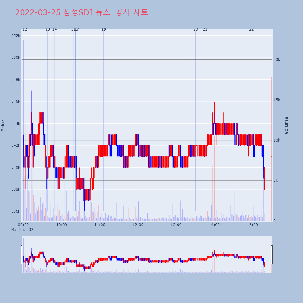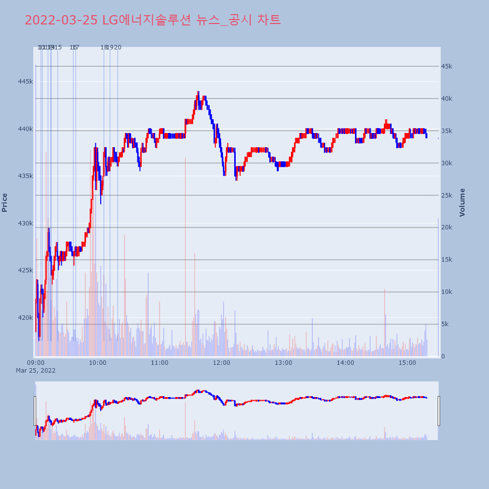 | 15 | [특징주] LG에너지솔루션, 북미 배터리 생산공장 투자에 4%↑ 제목 : [특징주] LG에너지솔루션, 북미 배터리 생산 | 인포스탁 | LG에너지솔루션 | 2022-03-25 09:21:19 |